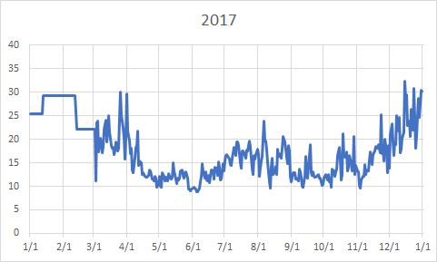 2018年が終了したので、2017/03/03〜2017/12/31まで(Fig1)と、2018年一年間の日毎の我が家の電力消費量(Fig2)をグラフにしてみました。横軸が日付(一日単位)で、縦軸が電力量(kWh)です。