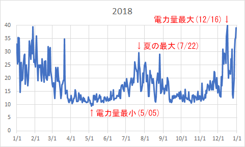 年によって天気や気温が違うので変動がありますが、冬と夏は主に暖房・冷房のためエアコンで電力消費が上がり、エアコンが要らない春と秋は下がります。2018年の夏はエアコンを付けないと屋内でも熱中症で倒れるような暑さだったので、電力消費も伸びています。
