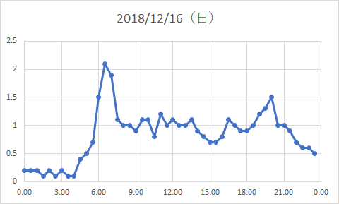 昨年(2018)、一番電力量が多かった(40.0kWh)12/16(日曜日)の30分ごとの電力量がこちら