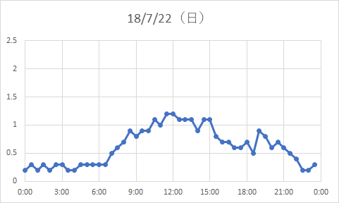 昨年(2018)、夏で一番電力量が多かった(29.7kWh)7/22(日曜日)の30分ごとの電力量がこちら