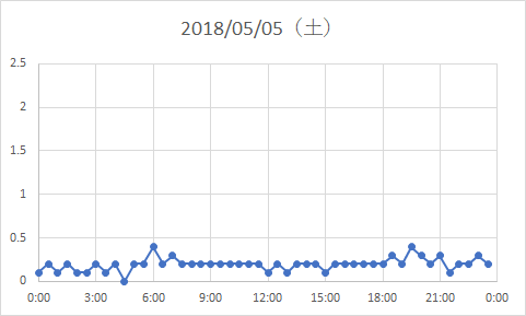 昨年(2018)、一番電力量が少なかった(9.4kWh) 5/05(土曜日)の30分ごとの電力量がこちら