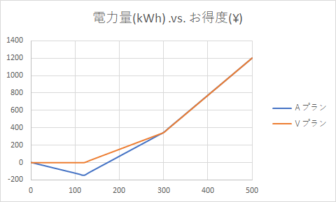 Vプランと比べた場合のAプランのメリットですが、計算式の違いで、300kWhでAプランは\8082、Vプランは\8082.6と\0.6の違いがあり、300kWhを越えてもこの違いはそのまま残ります。でも逆に300kWhを切ると、Vプランの方が得になるので、(当面300kWhを切ることはないと思いますが、旅行とかで全員が家を空けたりすることも考え)、Vプランに切り替えました(19/01/14)。電話一本で切り替えてもらえました。