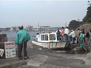 江ノ電で江の島に来ました。江の島に渡る江の島弁天橋から、釣り舟のような「乗合船」で一気に江の島の東端に着きます。