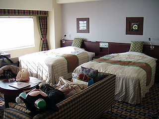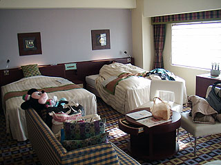今回の宿は、一休のオークションで落札した サンルートプラザ東京の「クラウンルーム」。43.1u。正規の値段は\72,765だそうですが、\40,000(4名まで同料金)で出品されていて、誰も他に応札する人は無く(オークションにしては割高な感じなのでしょう)、そのまま落札できました。