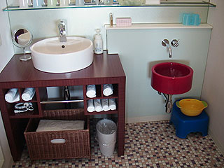 洗面台が大人用と子供用に2つ。子供用は水しか出ないのかと思いましたが、手前に引くと出て、ひねると湯温が変わる混合栓でした。