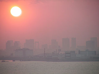 窓は西向き。ホテルの窓から見た、東京に沈みゆく夕日。