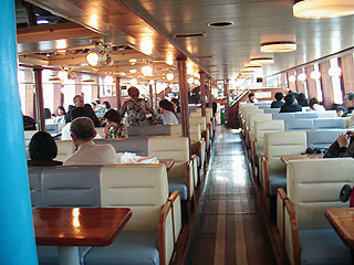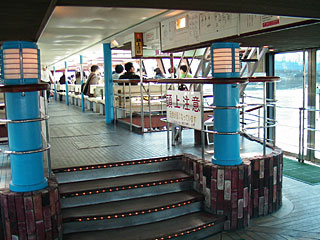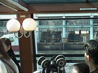 こちらが1階。ボックス席。前方は喫煙席。一番前に売店があります。コーヒーはホットもアイスも\250。アサヒの地ビールや船のチョロQなども販売。