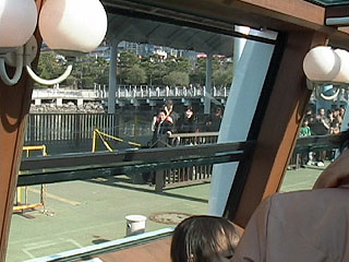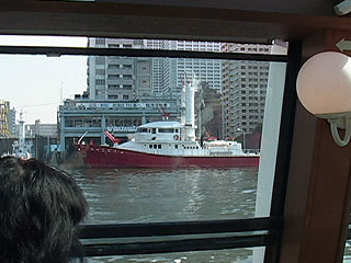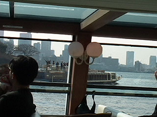 出航してしばらくは、首都高速6号向島線を左手に見ながら進みます。揺れはほとんどなく、のんびり進みます。首都高が右側に変わると浜町。首都高がいなくなって、右側にIBMのビルが見えると箱崎。右に聖路加タワーが見えると左は月島、高層マンションと昔ながらの下町が混在しています。勝どき橋をくぐって左に臨港消防署、放水銃を持った船が停泊しています。右に築地市場、築地市場が大きな港を持っているのを(当たり前ですが)始めて認識しました。そして緑の浜離宮。竹芝桟橋、日の出桟橋、晴海ふ頭。レインボーブリッジをくぐると終点、お台場海浜公園です。
