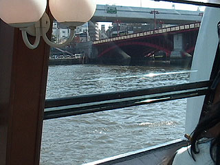 浅草からお台場まで、水上バスに乗りました。浅草から出ているのは、(1)浅草→浜離宮→日の出桟橋を結ぶ【隅田川ライン】と、(2)浅草→お台場海浜公園→豊洲を結ぶ【浅草・お台場直通ライン「ヒミコ」】の2種類。(1)は1時間2本の間隔で出ており、はとバスのコースでも使われているようです。(2)は一日3〜4便しか無く、今回は13:10の(1)が出航した直ぐあとの13:20に乗船しました。お台場まで1時間の船旅です。橋をくぐる時に橋の名前が船内アナウンスされます。