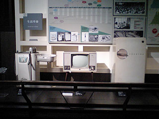 生活革命。左からローラーで絞る洗濯機、白黒テレビ、電気冷蔵庫。