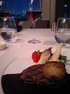 メインディッシュ、和牛フィレ肉の網焼き。外は暗くなってきました。