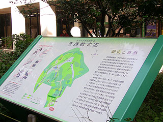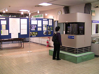 自然教育園の建物。誰かが覗いているのは「種が飛ぶ仕組み」という展示