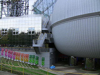 この科学館は、球形部分以外もピカピカの鏡張りの変わった建物です。