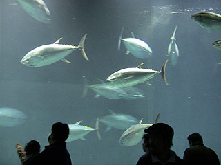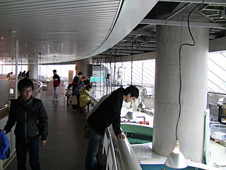 曇っている部分は、水平な水面で、あちら側に水がこぼれています。この下に水族園の展示があり、「海の中」というイメージ。