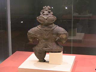 北方民族のイヌイットが雪中の光除けに着用した「遮光器」に似ていることから「遮光器土偶」と呼ばれているのだそうです。青森県木造町で出土。身長36.7cm