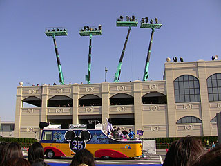 次に「夢よ、開け!」のかけ声で、前方から順にカメラに向かってサンシェイドを掲げていきます。そのままキープ。ミッキーがウインクするように、目を担当する人たちが、サンシェイドを表にしたり、裏にしたりしているようでした。