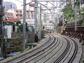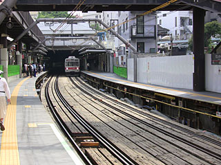 代官山駅のホーム端から見た渋谷方向。踏切が見えますが、その道は残り、ちょうどその手前で東横線は地下にもぐる予定。
