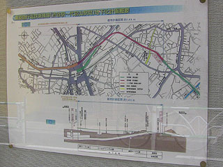 代官山に工事を見に行ってみました。東横線は平成24年に副都心線と乗り入れる予定。代官山は高台で、山手線までそんなに距離は無いのに、かなりの高低差があり、山手線と交差する時には完全にもぐってしまっているはずですから、どうするのだろう?と思っていましたが、フェンスに貼ってあった「地下化計画概要」を見ると、代官山の駅で既に、今より若干下る感じで傾斜が始まり、次の踏切の直前でトンネルに入ってしまう計画になっていました。電車を走らせながら、その下を工事するのは大変そう。