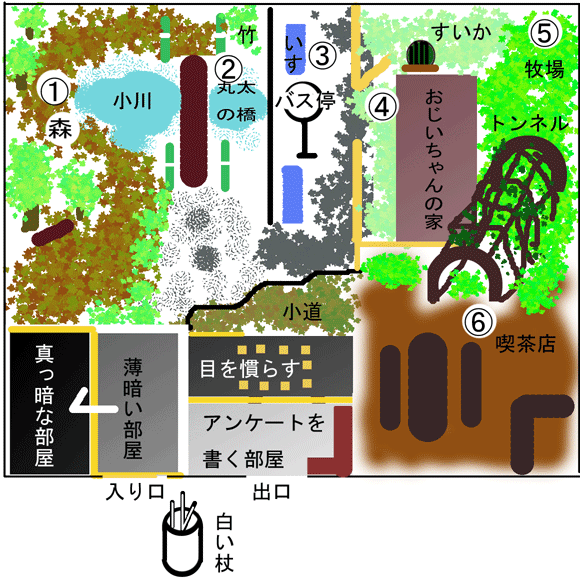 1 林 木が立っていて、セミが鳴いていて、足元には落ち葉や倒木や水場。 2 丸太の橋 丸太を2本並べたようなやつ。落ちるとどうなるのか?分かりませんが、足の裏の感触に従いすりすり進めば、それほど難しくありません。 3 バス停 バスを待つためのベンチがあり、交代で座ります。 4 おじいちゃんの家。 縁側(えんがわ)に座り、靴を脱いで家に上がります。家に上がると、敷居を境に畳になって、ちゃぶ台が置いてあって、その上には玉ねぎとジャガイモとオクラの入った食器と蚊取りぶた。ちゃぶ台の周りには座布団。奥には床の間、押入れ、茶だんす、ラジオ(ラジカセ?)、黒電。押入れの中にござ。 5 牧場 おじいちゃんの家を出て進むと牧場。足元はふわふわ(牧草?)で、牛が鳴いています。 6 喫茶店 木のトンネルをくぐると喫茶店。ベンチに座っておしぼりをもらい、飲み物とお菓子をもらって食べます。飲み物は、麦茶、カルピスウォーター、グレープフルーツジュース、ビール、ワインの中から選択。全盲の女性がグラスに入れて運んでくれます。お菓子は海苔巻きせんべい。女の子が「歯の矯正中だけど食べる」と言っていました。