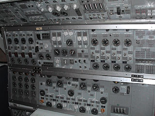 コックピットの中にあったフライトエンジニア用のパネル。たくさんの計器が整然と並んでいます。