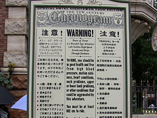 タワー・オブ・テラーの注意書き。ディズニーシーでお勧めアトラクションの一つです。