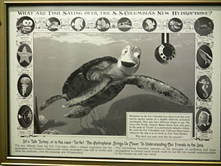 ディズニーシーに10月にできた新アトラクション「タートル・トーク」を見てきました。蒸気船SSコロンビア号の船尾に海底展望室があって、魚との会話を翻訳できる「ハイドロフォン」を使って、ファインディング・ニモに出てくるウミガメの「クラッシュ」と観客がインタラクティブに会話をする、という内容のアトラクションです。カメが「お嬢ちゃん今日はどこから来たの?」と聞いたり、カメに「何歳ですか?」と聞いたりします。おそらく声優さんがおしゃべりして、会話や内容に合わせて映像を動かしているのだと思いますが、自然な感じに感心。