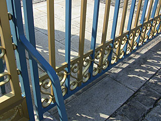 前庭の入口にある照明と門扉。門扉の金色とブルーの色づかいがいまいち、と妻。