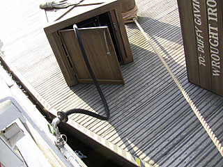 係留中、マークトウェイン号に何か補給していました。当方は燃料かと思いましたが、水だそうです。蒸気船だから、と納得。