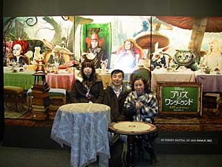 思っていたより本格的でした。撮影に使ったドアを通って「扉の広間」に始まり、「マッドハッターのお茶会」、「赤の女王の宮廷」、「白の女王の宮廷」の4つの部屋があり、撮影に使ったセットや小道具、衣装などが展示されていました。無料のイベントなのに、案内の人も何人もいるし、抽選会もやっていて当たると土産もくれるし、ポスターとパンフレットもくれるし、写真も撮ってくれました。