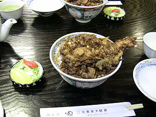 天丼(えび1・きす1・かき揚げ1)\1,500。計1時間ほど待って、やっとありつけました。