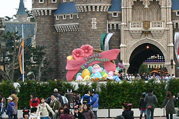 ディズニーランドは、今年から新しく「イースターワンダーランド」開催予定(4/1〜)。イースターの飾りが、植木で囲んで隠してありました。