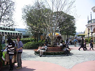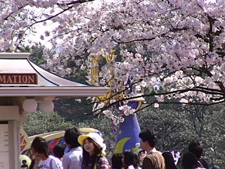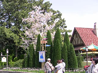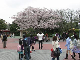 東京ディズニーランドにも桜が2〜3本あります。ちょっと遅咲きのようで本日満開。これはインフォメーションボード横の桜。