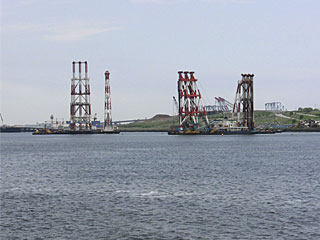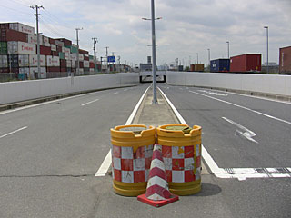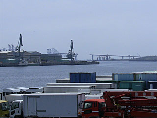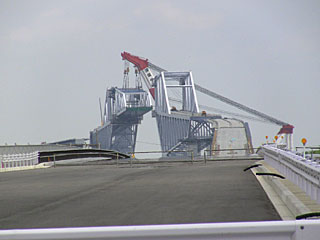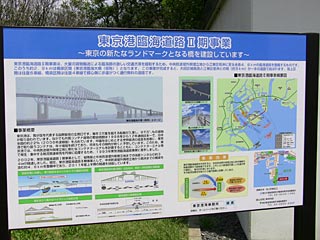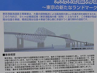 首都高の辰巳パーキング付近から見えて、気になっていた作りかけの橋を見に行ってきました。この橋は仮称「東京港臨海大橋」。2002年、東京港臨海道路T期事業として、城南島と中央防波堤外側埋立地までの海底トンネルの約3.4kmが開通しました。現在、東京港臨海道路U期事業として、中央防波堤外側埋立地から若洲までの橋梁を含む約4.6kmを整備中であり、2011年度上半期の開通を目指している(看板の説明書き)そうです。大田区とディズニーリゾートが無料の太い道路で近くなりますね。