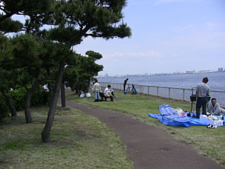 10km以上迂回して、反対側の若洲公園に来ました。この日は天気が良かったので、バーベキューや釣りをする人たちで駐車場は満車。無料の駐車場に誘導されてラッキー。