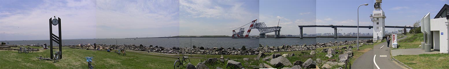 D若洲公園の先はサイクリングロードが続いており、広く芝生になっています。パノラマ的に撮影してつないでみました。