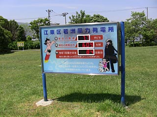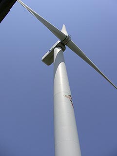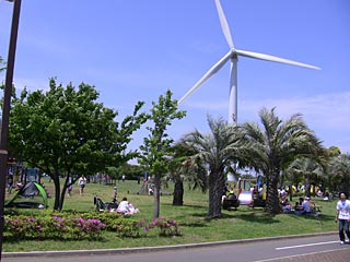 広場にある大きな風力発電機。IHI製、高さ100m、ブレードの半径40m、定格出力1,950kW。