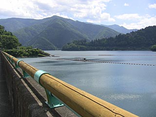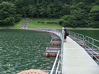 奥多摩湖の深山橋を渡った右側にあるそば屋「陣屋」で昼食。 3連休の中日だったので、バイクツーリングの団体が入って来ました(我々は先に入っていた)。 いつもはそばの大盛りがあるようで、バイクの人がお店の人に 「夏休みに入ったので大盛りは無い」と言われていました。 奥多摩湖にかかるドラム缶橋を渡ってみました。釣り人用の橋らしいのですが、 本当の目的は不明。ドラム缶では無く、プラスチックの浮きで浮かしており、 若干日が当たって色あせ・劣化気味の様子。奥多摩湖を間近で見たら、小さな魚がたくさん見えました。 戻ってきて、 水と緑のふれあい館に車を止めて、小河内ダムを見て来ました。 展望塔に登れます。エレベータはありませんが、エアコンが入っていて涼しかった。 小河内ダムのデータ:利用目的:上水道、発電。総貯水量189M立方メートル。発電量19MW。 この日の貯水量は160.69M立方メートル、貯水率86%でした。 小河内ダム自体は昭和32年竣工ですが、昭和55年に新設した第二取水施設があります(上はヘリポートになっている)。 第二取水施設はダム上層の暖かい水を取り出し多摩川に流すのが目的で、4〜11月に使っているとのこと。 水と緑のふれあい館で3Dシアターを見てきました。内容は「水と緑のふるさと奥多摩」。14:00から16分間の 上映。内容は、お父さんが仕事で来れなくなった姉と弟が、バスで奥多摩に来て、声だけの妖精(白いもやもや?)から 奥多摩の紹介を受ける内容で、最後に仕事を早く切り上げたお父さんがちょっとだけ出て来ました (父の出番は少なかった)。奥多摩の四季を3D撮影しており、それなりにお金がかかっていると思います。