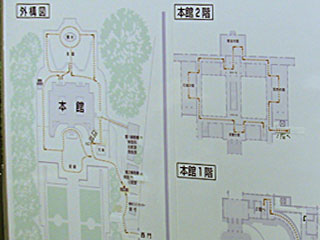 外に書いてあった見取り図。本館2Fが主な見学コースで、下が北ですが、北の「彩鸞(さいらん)の間」、東側の「花鳥の間」、南側の「朝日の間」、西側の「羽衣の間」の順に見学します。