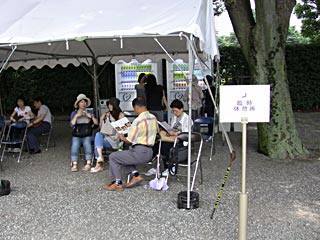 建物の東側にテントを張った「臨時休憩所」と仮設の自動販売機。「綾鷹」のペットボトル500mlが\100で、儲けるつもりはなさそう。