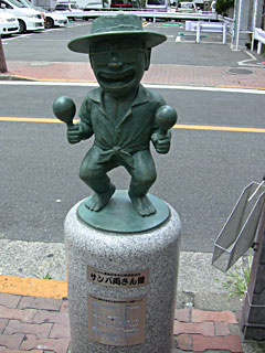 中央商店街、パチンコ屋の前にある「サンバ両さん像」。先日左手のマラカスがもぎ取られたのですが、こちらは修理済みでした。