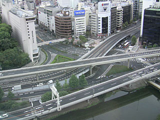 次の日の朝、部屋から見た風景。良く通る首都高4号線です。
