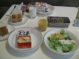 「ライトブレックファーストブッフェ」ということですが、サラダ、フルーツ、ヨーグルト、シリアル、コーヒー・紅茶が取り放題。温かいパンは別途持ってきてくれます。