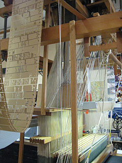 ←西陣織手機。左側にあるシートのデジタルデータ(穴の有る/無し)でデザインが決まるようです。