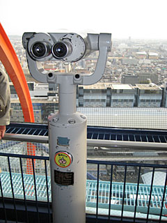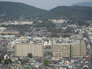 夕方、早めにレンタカーを返却して、京都駅前の「京都タワー」に登ってみました。まずビルの屋上11Fにエレベータで上がり、さらに展望エレベータ(外が見えるわけでは無く、展望台に行くエレベータという意味らしい)で展望室に上がります。地上100mは今となってはそんなに高くありませんが、周囲に高層ビルが無いので遠くまで見通せます。