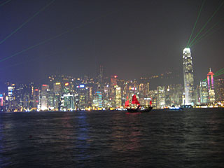地下鉄でアベニュー・オブ・スターズ(星光大道)に戻ってきて、20:00〜の「シンフォニー・オブ・ライツ」を見ました。ビクトリア港に建ついくつものビルが、音楽とナレーションに合わせてレーザーやライトを放つ無料のショーです。曲は一部中国風でした。