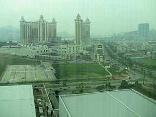 部屋からの眺望。正面の立派な建物は、新しくできたギャラクシー(ホテル&カジノ)。あちらの方が豪華。カジノ業界の競争は熾烈な様です。