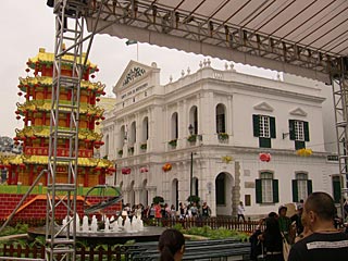 さらに歩いた先にある「仁慈堂」(白い建物)と「セナド広場」。セナド広場には、テントや秋分のお祝いの5重の塔が置かれていました。