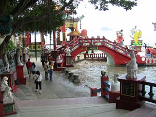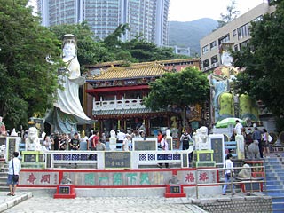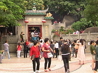 レパルスベイの端にあるのが天后廟(ティンハウミュウ)。観音様が立っています。ガイドさんが言うには、人間1番大切なのは健康。健康の神様が左の観音様。2番目に大切なのがお金。商売繁盛の神様は、ずっと小さくて観音様の左にあり(写真には写っていない)、上から下まで撫ぜると、現在から将来に渡ってお金に不自由しないのだそう。