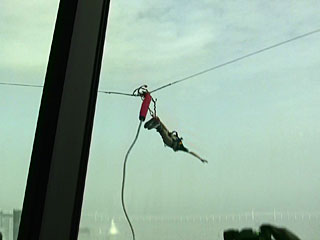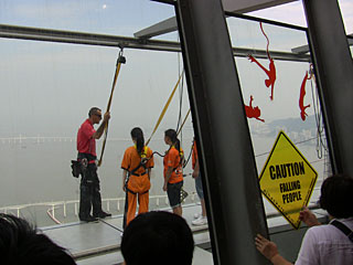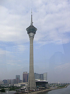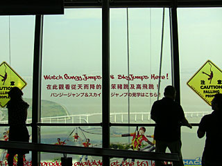このタワーは観光用のタワーで、バンジージャンプ(HK$2,488)、スカイジャンプ(ゆっくり降りる、HK$2,488)、スカイウォーク(タワー外縁を歩く、HK$588)など、過激な体験が可能。(1HK$≒1MOP≒\10)