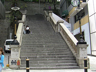 歩いて、ダデルストリートの石段とガス塔。香港で最も古い現役のガス灯だそうです。